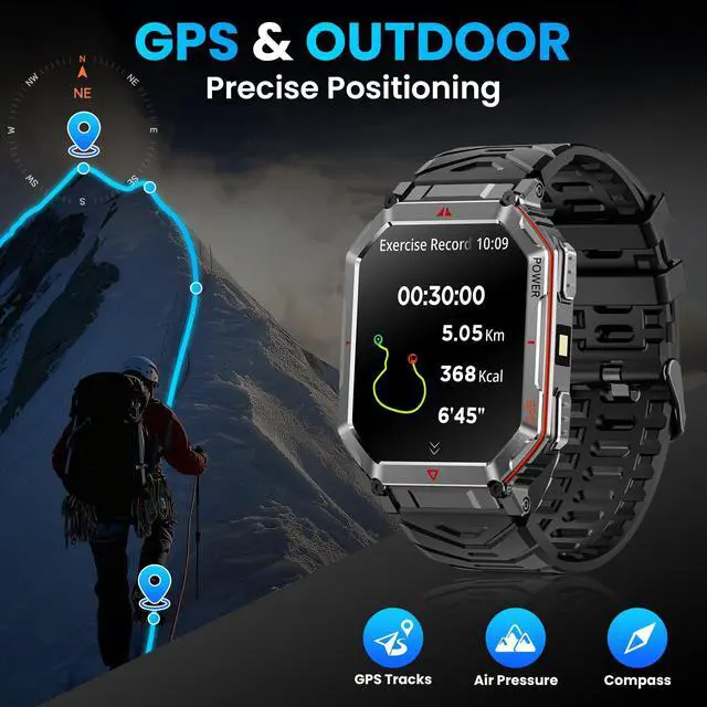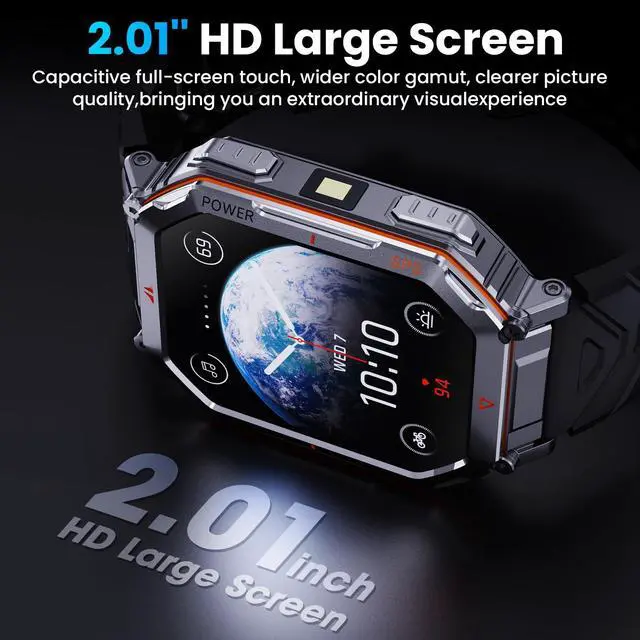The is the ultimate military smart watch for men, combining rugged durability with advanced tech. This GPS smart watch for men features a 2.01" HD display, IP68 waterproof rating, and a massive battery for long-lasting performance. Track your missions with precision using GPS, altitude, and compass tools, or switch between three flashlight modes for low-light conditions. As a smart watch for Android phones (and iOS), it keeps you connected with call/SMS alerts and quick replies. Monitor your health with heart rate, SpO2, and sleep tracking, and push limits with multiple sports modes. Whether you're on duty, hiking, or training, this military smart watch is your tactical companion. Durable. Smart. Ready for anything. #1 choice in smart watches for men who demand more.