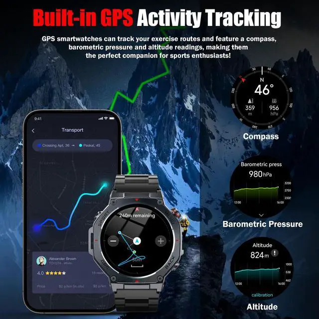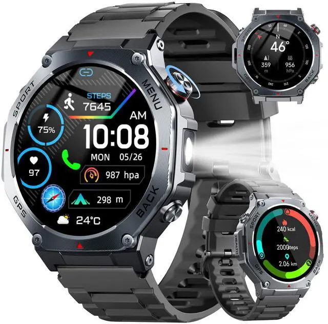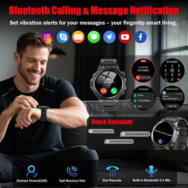 - Multifunctional Smart Watch for Men: The fitness watch features built-in stereo speaker and a microphone, supports Bluetooth voice calls. Rugged smart watch featuring message notification, AI voice assistant, blood oxygen, heart rate, sleep monitoring, alarm clock, calculator, breathing exercises, sedentary reminders, stopwatch, camera control, music playback, weather forecasts, multiple watch faces , hydration reminders.