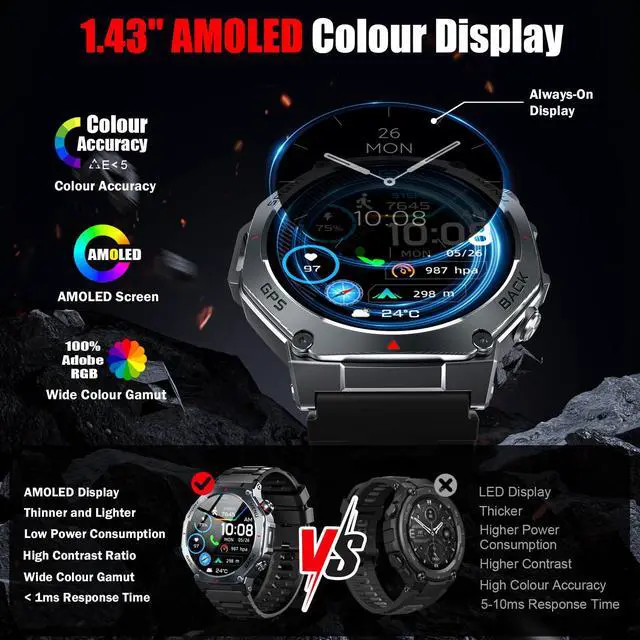 - AMOLED Color and Always-On Display: The ios android smart watch is equipped with a 1.43-inch AMOLED color display, which delivers vibrant and vivid colors even outdoor. The display is constructed from high-strength tempered glass, offering exceptional scratch and interference resistance. The function of "Always-On Display" means that the display is always online to supports resting screen to check the time.
