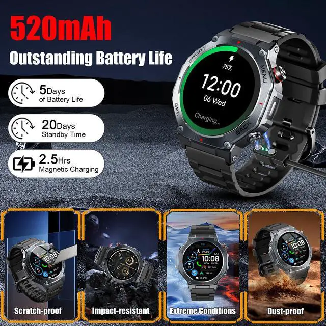 - 5ATM Waterproof & Long Battery Life: This men's fitness watch offers 5ATM waterproof, dustproof, and shockproof features. It withstands rain, sweat, swimming, and impacts, making it perfect for any adventure. The 520mAh battery lasts 7-10 days on a full charge, and only takes 2 hours to reach 100%. In standby mode, it lasts up to 20 days, (The continuous use time of GPS is about 3 days). making it perfect for all-day wear and continuous health tracking.