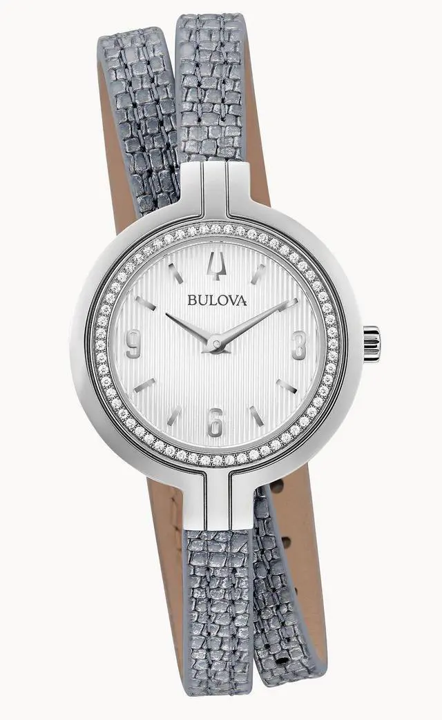 Stainless steel case. Lizard grain texture leather (double wrap) strap. Fixed stainless steel bezel set with diamonds. White dial. Bulova calibre GL26 quartz movement. Mineral crystal. Case 30 mm. Case thickness- 6.9 mm. Band width- 7 mm. Tang clasp. Water resistant 30 meters.