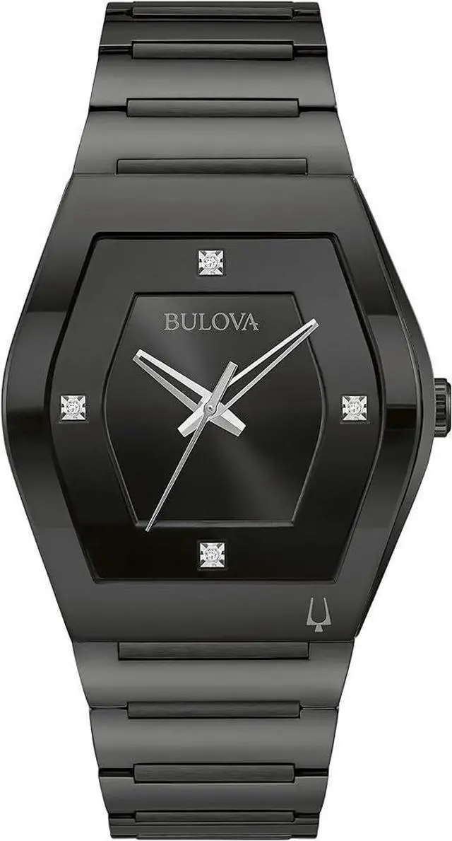Sleek contemporary design with a refined polished look. Black curved tonneau stainless steel case. Signature Modern metalized edge-to-edge crystal. Monochrome black aesthetic. Black 3-hand dial. Four hand-set diamonds at 15-minute markers. Silver tone accents. Black stainless steel bracelet. Deployant clasp with push buttons. Streamlined appearance. Quartz movement (GL34). Battery-powered for accurate timekeeping. 40mm case width. Screw-back case. Curved mineral crystal. Water Resistance- 30 meters (3 ATM). 3-hand display. Diamond accents.