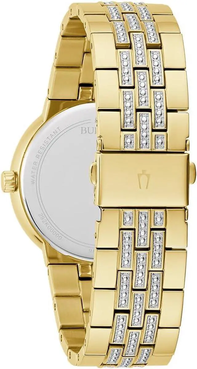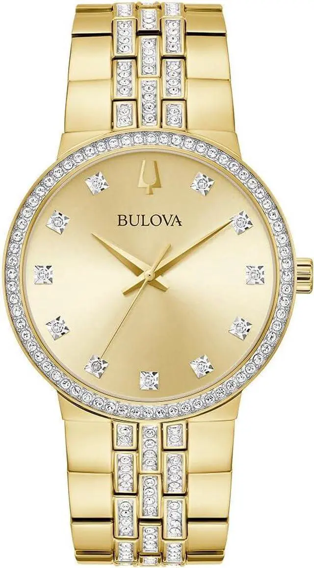 Gold-tone stainless steel case. gold-tone stainless steel bracelet set with crystals. Fixed gold-tone bezel with crystal set. Champagne dial with gold-tone hands and crystal hour markers. Quartz movement. Scratch resistant mineral crystal. Case 40 mm. Deployment with push button release clasp. Water resistant 30 meters.