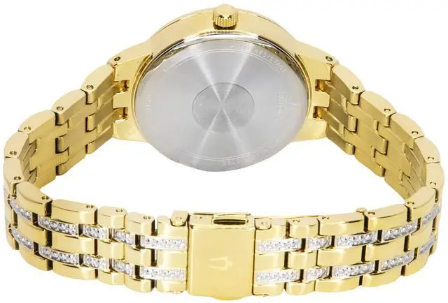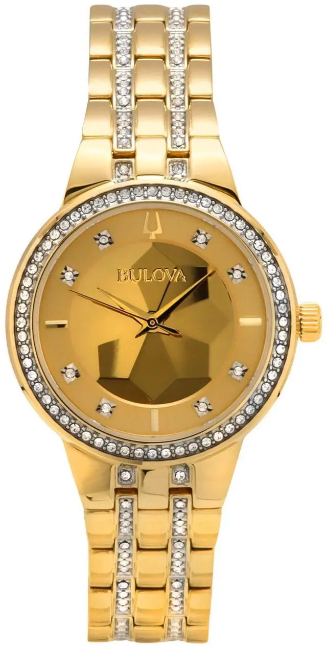 Bulova Classic Crystal Phantom Gold Tone Stainless Steel Champagne Dial Quartz 97L176 Women's WatchDazzle with the Bulova 97L176's luxurious champagne dial, beautifully adorned with crystal accentsâa feature that radiates elegance and sophistication. The quartz movement ensures precise timekeeping, making it a reliable companion for every occasion. Encased in gold-tone stainless steel, this watch offers both durability and a refined, glamorous finish. Perfect for those who appreciate a blend of classic style and modern luxury, this timepiece is a statement of elegance.