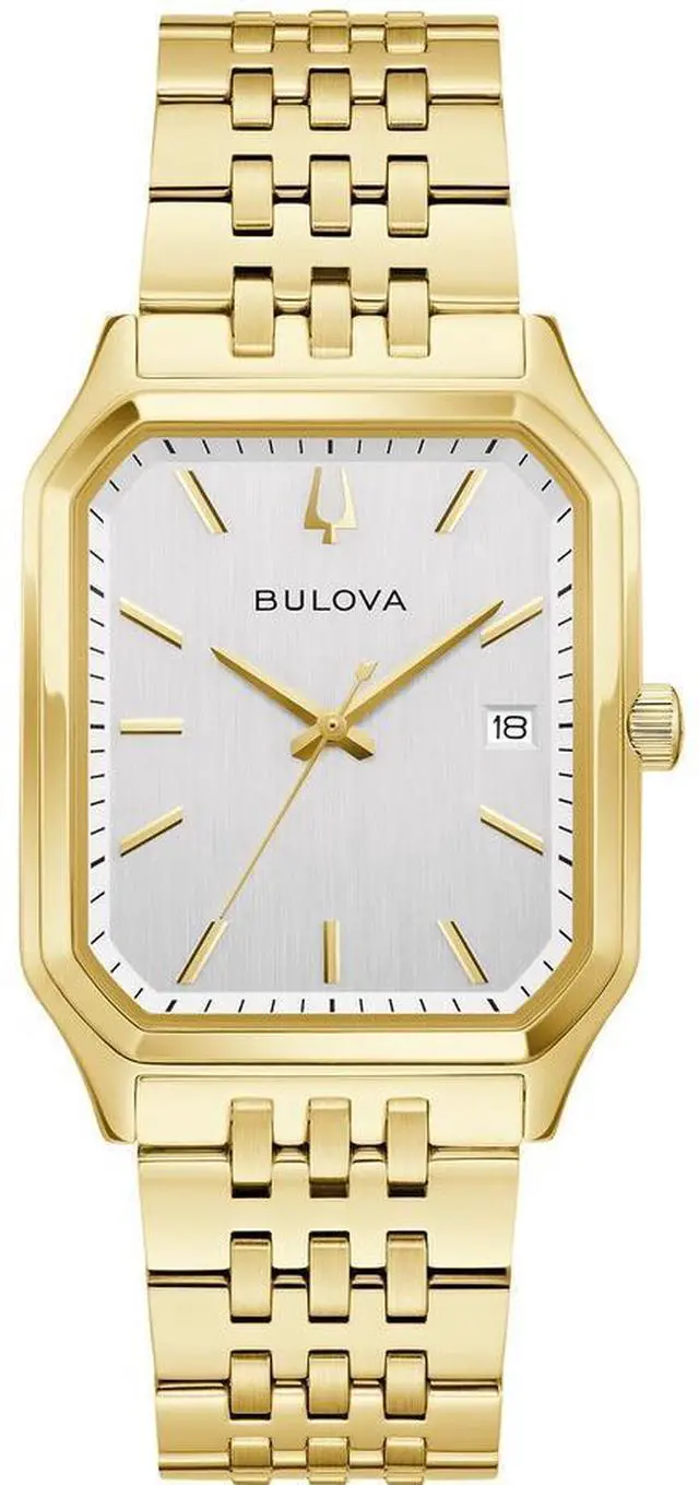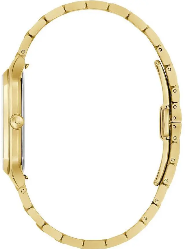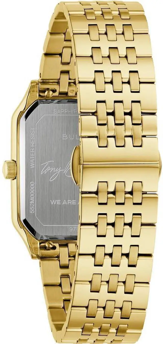 Partnership with the Tony Bennett Foundation. We Are All Here Duet Bulova mens timepiece. Celebrates the timelessness and talent of the memorable crooner. Inspiration from the classic design of the 1980s. 32mm gold tone stainless steel case. Sleek angular silhouette. Accented with gold tone hands and markers. Vertically brushed silver tone dial. Seconds hand counterbalance shaped like Bennetts signature folded pocket square. Tony Bennetts signature gracing the case back. Watch pays tribute to one of the greatest performers of all time. Gold tone stainless steel push button bracelet.