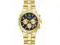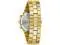 Gold tone stainless steel case and bracelet. Fixed gold tone stainless steel bezel. Black dial. Gold tone hands. Index hour markers. Minute markers around the outer rim. Dial Type- Analog. Date display between 4 and 5 oclock position. Chronograph. Three sub dials displaying 60 second 60 minute and 24 hour. Movement- Quartz. Scratch resistant sapphire crystal. Pull push crown. Solid case back. Case Shape- Round. Case Size- 40 mm. Band Width- 23 mm. Deployment with push button release clasp. Water resistant at 100 meters.