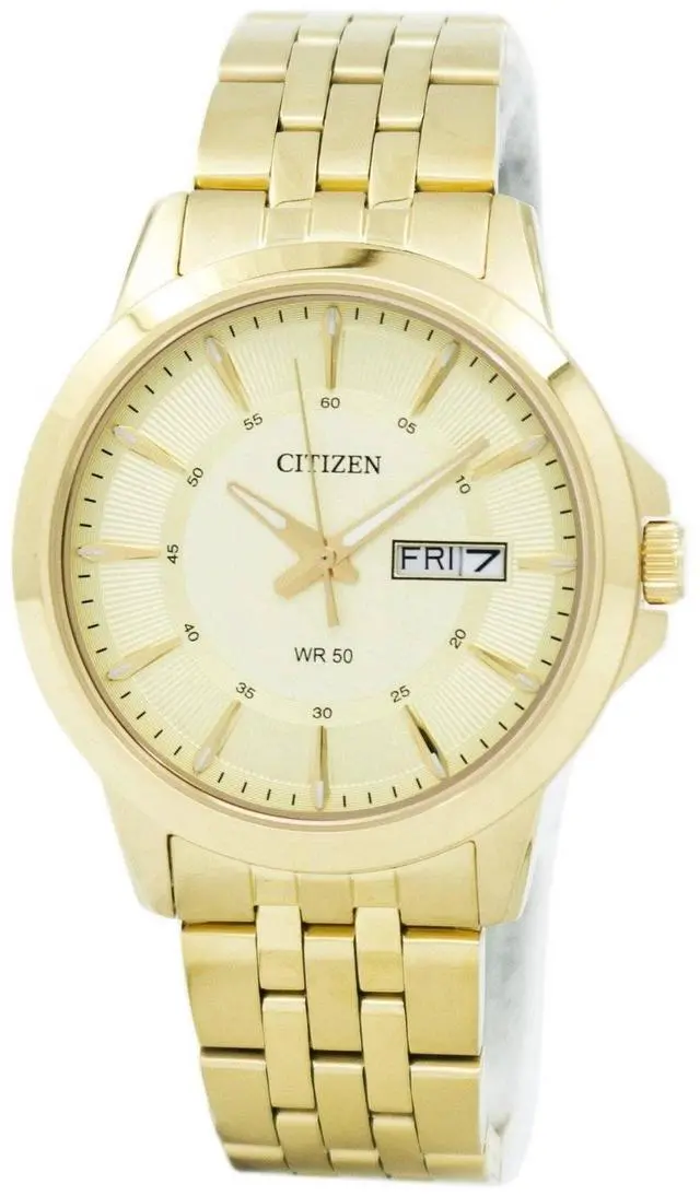 Who says casual and classy dont mesh Theres always a way to make it work. Laid-back doesnt have to mean boring or drab, and this Citizen watch is proof for those who doubt it. Its the perfect in-between, a duo of dapper and down-to-earth. It features a 41MM stainless steel case that makes for a dapper appearance right off the bat, and creates a subtle contrast against the watchs gold dial thats perfectly pleasing to the eye. The hands on the dial are gold, which contributes to the masculine elegance of the piece. The watchs sleek applied indexes contribute to its classy feel as well. However, the combination of its band and minimalistic design is what makes this timepiece a mix of sharp and nonchalant. Although the details are undoubtedly classy in the refined shade of gold, there isnt too much happening on the face of the watch. The details are keen but few. The band also plays a major role in keeping this timepiece grounded with its gold stainless-steel composition. Though a fresh hybrid of casual and sleek, this watch is hardy nonetheless. It has a water resistance of up to 50 meters / 165 feet / 5 atm, and its dial is protected by a mineral crystal. You dont have to worry about destroying this bad boy anytime soon. The best part It uses japanese-quartz movement, so youre guaranteed some serious accuracy and precision from this time-keeper. So whether youre at watching a movie at home, in the office, working out, at an upscale event, or going out with the boys, you can rest assured that this watch will last you as long as you need it to. Its durable, charmingly simple, and polished all in one.
