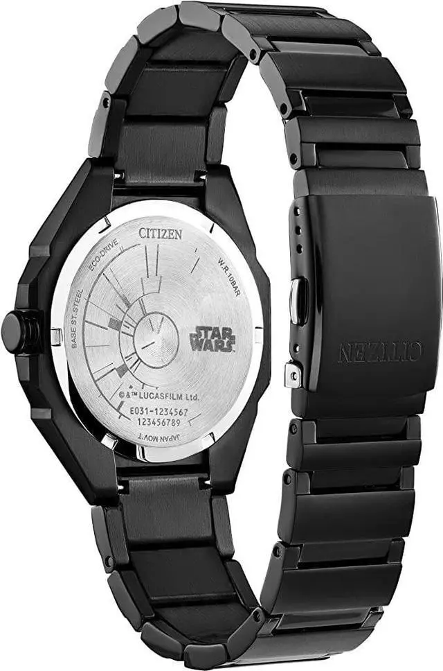 The stainless-steel black bracelet fastens with a fold over clasp with push buttons and illustration of the Death Star is depicted on the case back with the Star Wars logo. This technological terror of a timepiece is powered by Eco-Drive technology and never needs a battery; it is powered by any galactic light source.