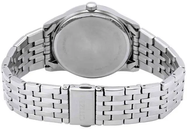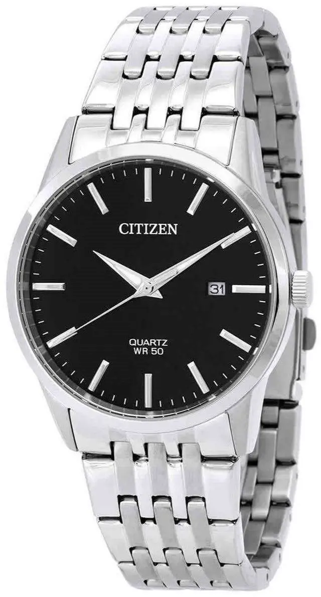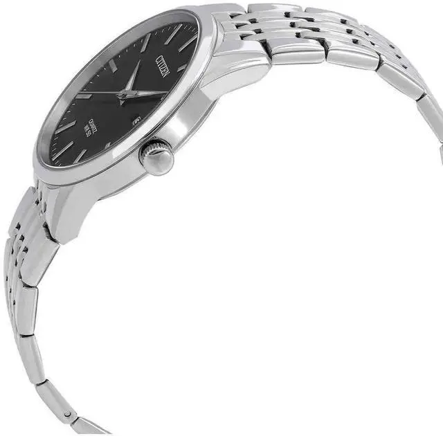 Citizen Black Dial Stainless Steel Quartz BI5000-87E Men's Watch Endurance, reliability and styling all put in together, this watch keeps pace with modern, working, urban lifestyle and also looks good while being at it. A strong stainless steel construction makes it resistant to any impact you may face in the city, while its smooth, black face becomes prominent on a sleek, silver tone body. Blends seamlessly with classic, elegant, sophisticated attire.