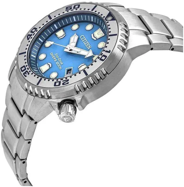 Citizen BN0165-55L captivates with its serene light blue dial, a standout feature for those who value elegance in performance. Equipped with 200-meter water resistance and ISO certification, itâs built for serious diving adventures. The Eco-Drive technology ensures uninterrupted timekeeping, powered by any light source. Its robust stainless steel case and bracelet complete the design, offering durability and style for both underwater and everyday wear.
