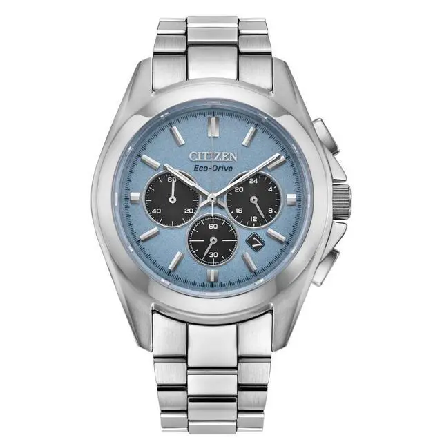 Citizen Sport Luxury Chronograph Stainless Steel Light Blue Dial Eco-Drive CA4680-55L 100M Men's Watch