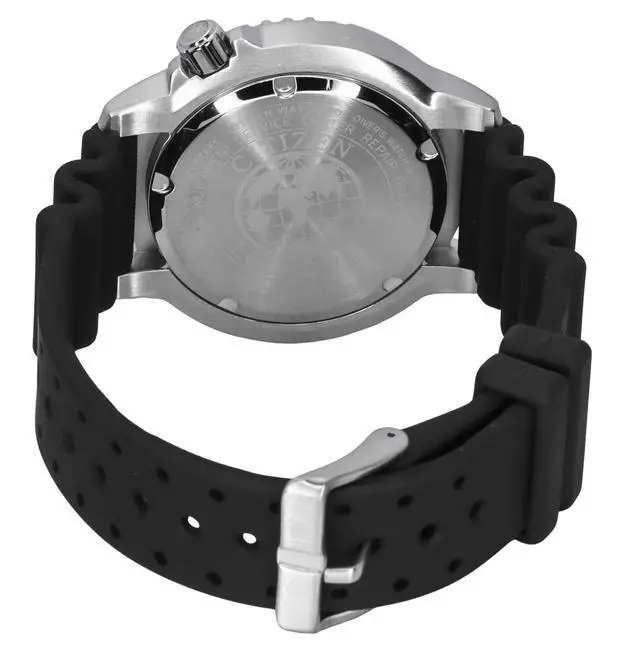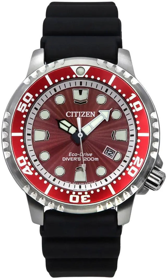 Citizen Promaster Divers Eco-Drive BN0159-15X 200M Men's Watch With Silicone Strap Without Depth MarkerVibrant, attractive and astonishing, it is a serious diversâ watch that makes a wonderful addition to any serious watch collection. The bright red dial is something very unusual for dive watches and offers a clear and radiant view due to the metal accents. It has a rotating, textured bezel, which is another fascinating element of the watch, while the polyurethane band is another striking feature that ensures itâs not going to leave you irrespective of your mission. This Watch Comes Without Scuba Tank Box
