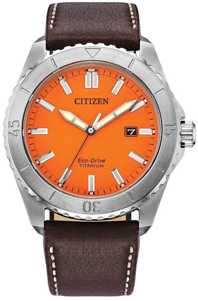 Stainless steel case, Leather strap, Orange dial, Quartz movement, Scratch resistant sapphire, Water resistant up to 10 ATM - 100 meters - 330 feet