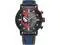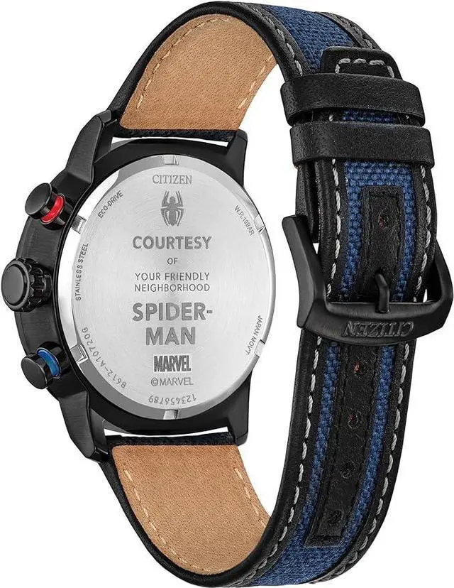The markers and his eye are illuminated, and a tachymeter appears on the bezel. Etched on the stainless steel case back is Courtesy Of Your Friendly Neighborhood Spider-Man, and the watch features a blue Cordura nylon and black leather strap.