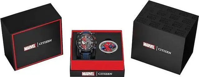 An all-new boxed set with a chronograph watch and collectible coin conveys the essence of the young web-slinger with 44mm black IP stainless steel case containing a divided black matte dial: on the left is his partially depicted mask, and the right showcases half of the famed arachnid symbol