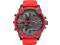 Round gunmetal stainless steel case with a gray dial and red accents; red silicone-wrapped stainless steel band with deployment clasp closure