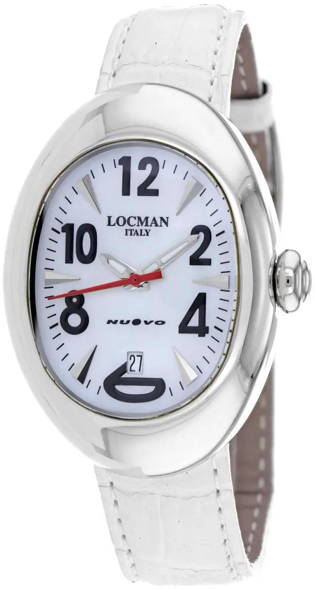 Stainless steel case, Leather strap, White dial, Quartz movement, Scrtach resistant mineral, Water resistant up to 3 ATM - 30 meters - 100 feet