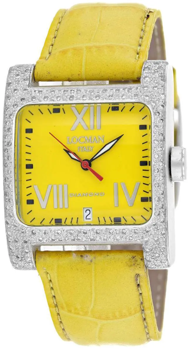 Alluminum case, Leather strap, Yellow dial, Quartz movement, Scratch resistant mineral, Water resistant up to 3 ATM - 30 meters - 100 feet