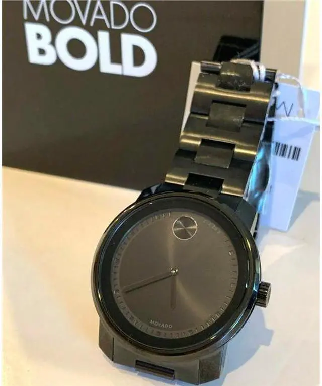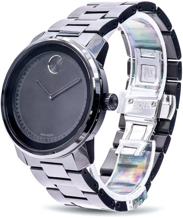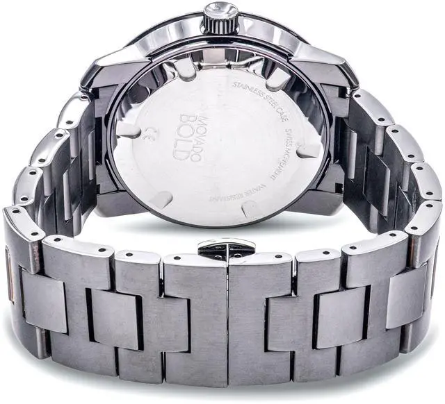 Stainless steel with black ionic plate case and bracelet. Black dial. Swiss quartz movement. K-1 mineral crystal. Case 42mm. 22mm band width. Deployant clasp closure. Water resistant 30 meters.