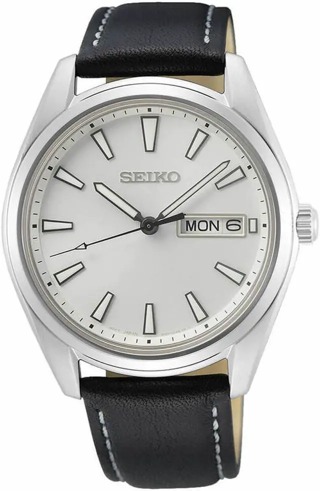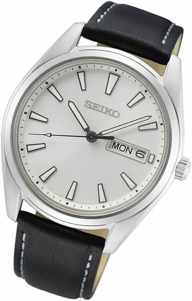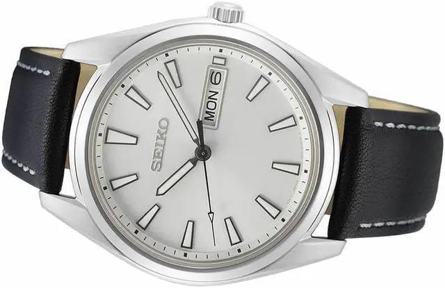 The Seiko SUR447 watch comes with a silver color dial with luminous filled silvertone hands and hour markers. It has 40mm diameter stainless case with a fixed bezel, push-pull crown, and a day-date window at 3:00 on the dial. The watch is powered by a Seiko 6N53 quartz movement and it comes with a scratch resistant sapphire crystal. This watch is water resistant to 100 meters and it comes with a black leather strap with white contrasting stitching. The lug width is 20mm. Weight is 56 grams.