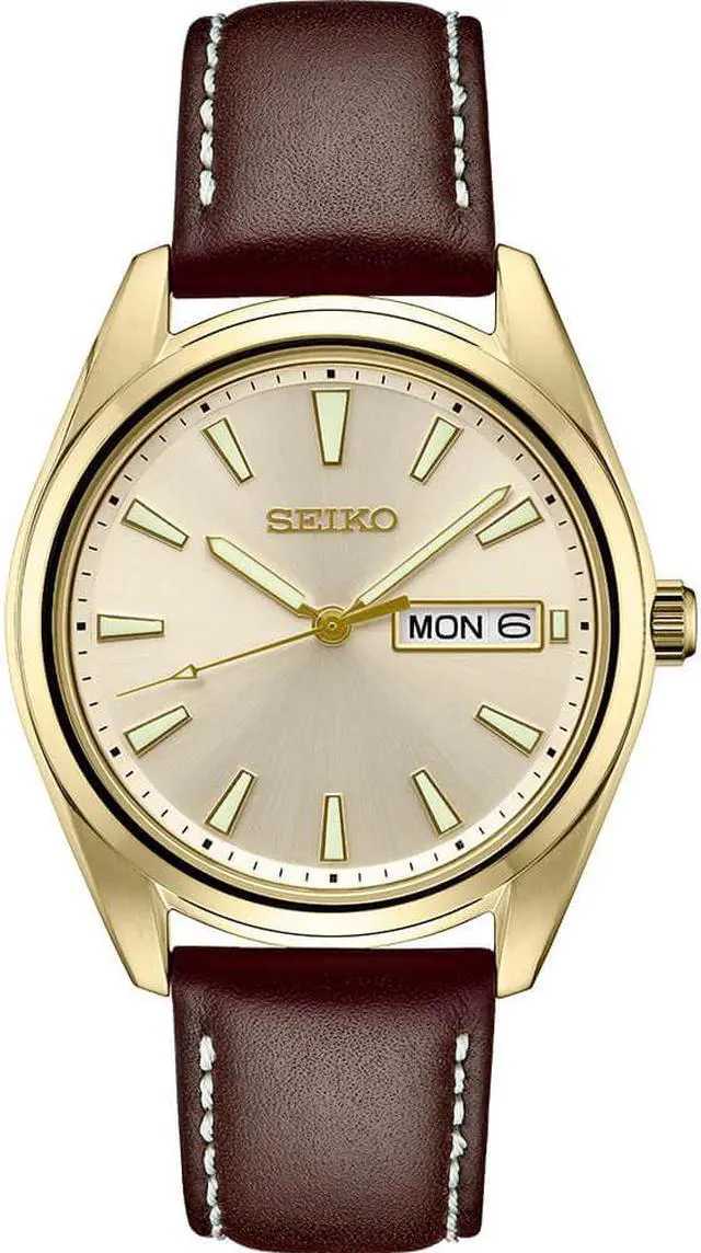 - From the Essentials Collection - Light champagne sunray dial with gold accents - Day/date calendar - LumiBrite hands and markers - Sapphire crystal -