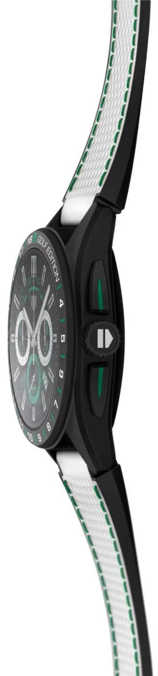 Introducing the most luxurious connected golf watch ever customized for your best performance on the golf course. The TAG Heuer Connected Golf Edition adds superior technology to every swing an exclusive collectors set for the discerning golfer. With sharp and sporty lugs the 45mm ultra-light titanium case has a matt sandblasted DLC finishing and offers a seamless and ergonomic fit on the wrist. Crafted for enhanced performance and style on the green the smartwatch shows a golf engraving on the ceramic bezel and comes with an exclusive TAG Heuer Golf app to track your performance on over 40000 golf courses.