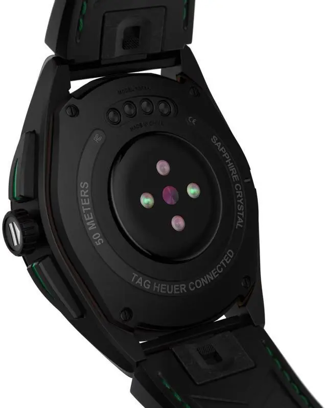 Strap Material- Rubber. Color- Green & White. Folding Clasp Push-Buttons. Sand Blasted Titanium grade 2. Interchangeable strap system. Battery Life- A full day including multiple hours of sport session. Heart rate. Compass. Microphone. Barometer. Operating system Wear OS by Google. Compatibility Android 8.1 up to 15 (except Go edition) / iOS 15.4 up to 18.4. Pre-installed apps & Features- TAG Heuer Golf - TAG Heuer Sports (Running Cycling Fitness Swimming other sports) - TAG Heuer Wellness - NFT Viewer. Qualcomm Snapdragon Wear 4100. AMOLED display 1.39.