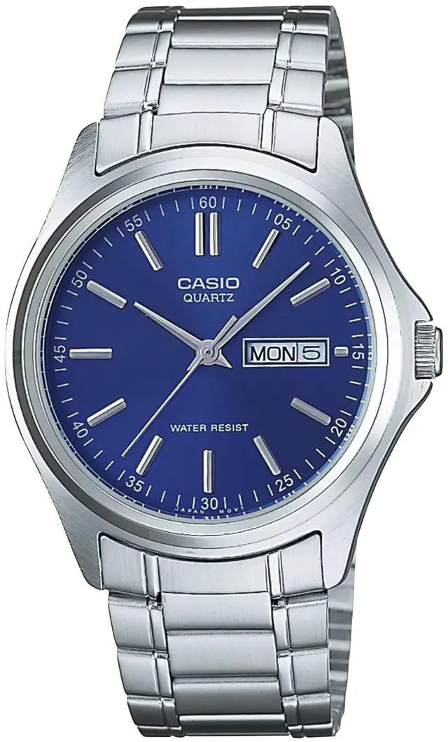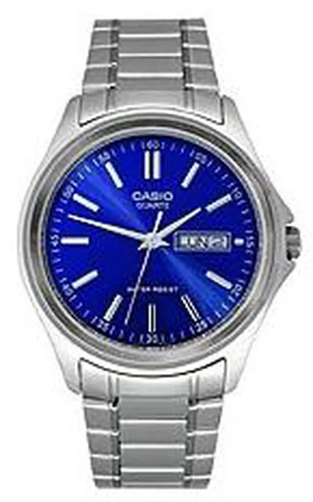 Quartz movement, Dress watch, Silver-tone hands and indices, White second numbers and indices, Bilingual day/date display, Polished stainless steel bezel, case and crown, Brushed stainless steel caseback, Water resistant