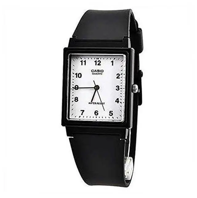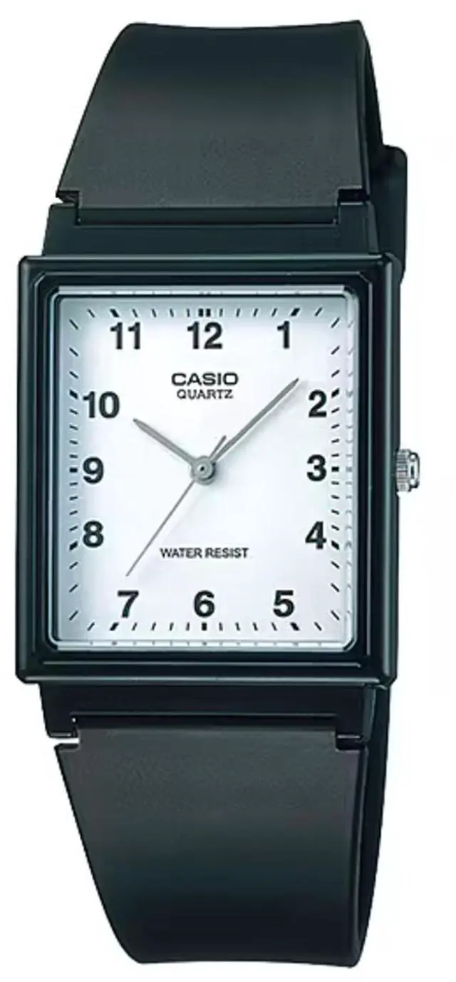The Casio MQ-27-7B blends minimalist sophistication with daily practicality. Its crisp white dial contrasts beautifully against the black rectangular case and strap, creating a clean and timeless design. The easy-to-read numerals and reliable analog movement make it an excellent choice for everyday wear, whether youre dressing for work, leisure, or travel. Lightweight, comfortable, and effortlessly stylish, this watch captures Casios signature simplicity.