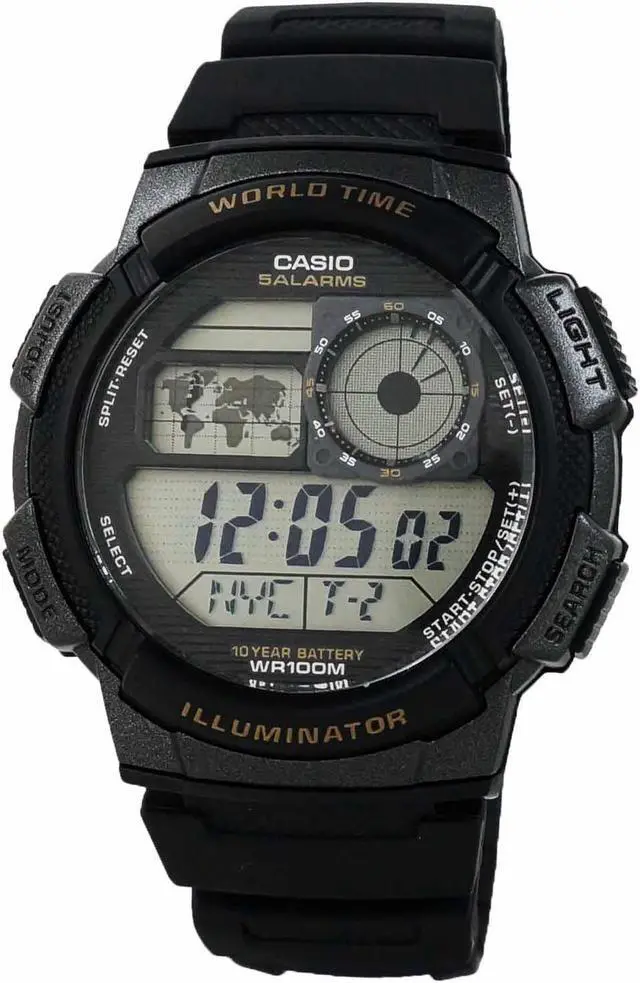 Gents Casio watch collection. Resin case. Black resin band. 248-Segment High Density LCD with digital analog hand format. World map time zone display. Date and calendar display. 5 Alarms. Backlight. Hourly time signal. Stopwatch. Countdown timer.