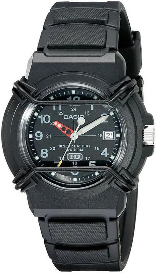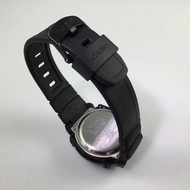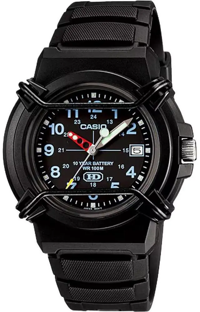 Gents Casio watch collection. Black tone case. Black resin strap. Black dial. Date display. Luminous hands.