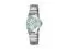 Quartz movement, Dress watch, Polished silver-tone hands, bar markers, and numbers, Small black indices, Polished stainless steel silver-tone mirrored bezel engraved with triangle and bar markers, Polished stainless steel silver-tone crown, Brushed stainless steel silver-tone case and caseback, Water resistant
