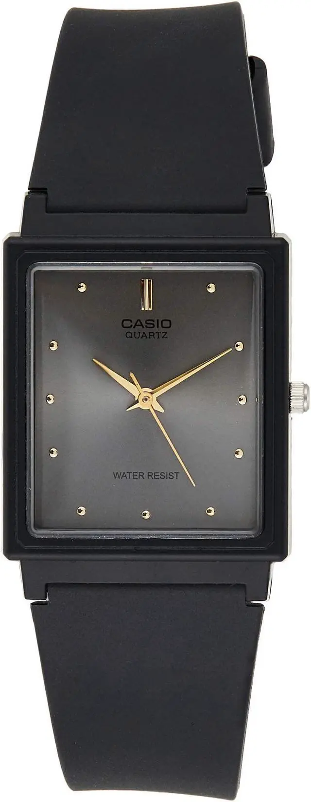 The Casio MQ-38-8A captures timeless minimalism with its refined design. Featuring a rectangular black dial with gold-tone hands and markers, this womens watch is paired with a smooth cream strap that enhances its soft, modern appeal. Lightweight, elegant, and easy to style, it transitions effortlessly from daywear to evening looks. With dependable quartz movement and water resistance, its the perfect everyday watch for women who appreciate clean, classic design.