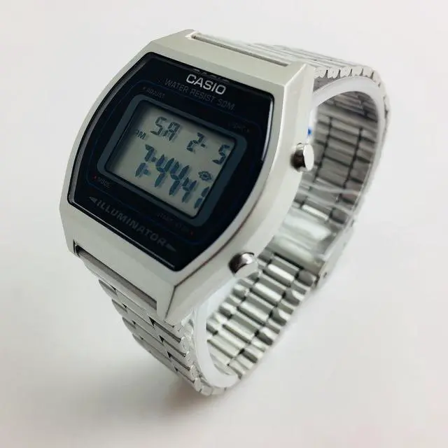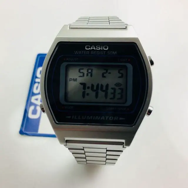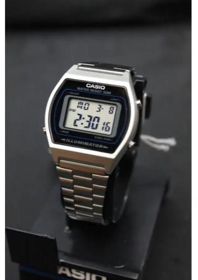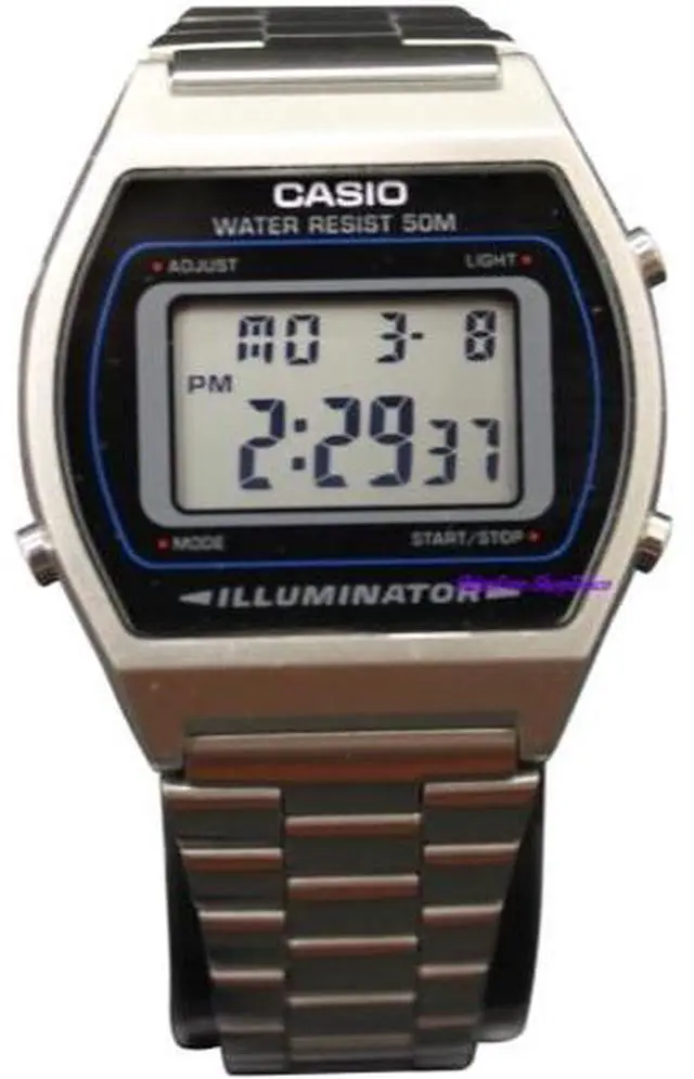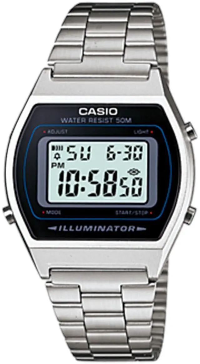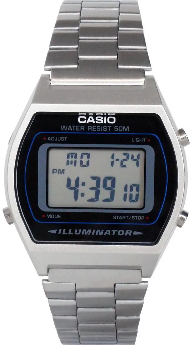 Men's Casio watch collection. Stainless steel case. Stainless steel link band. Digital dial. Micro light. Alarm. Date and calendar.