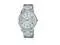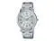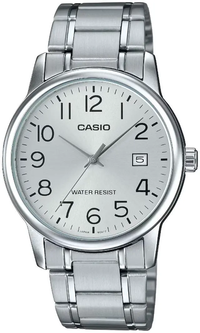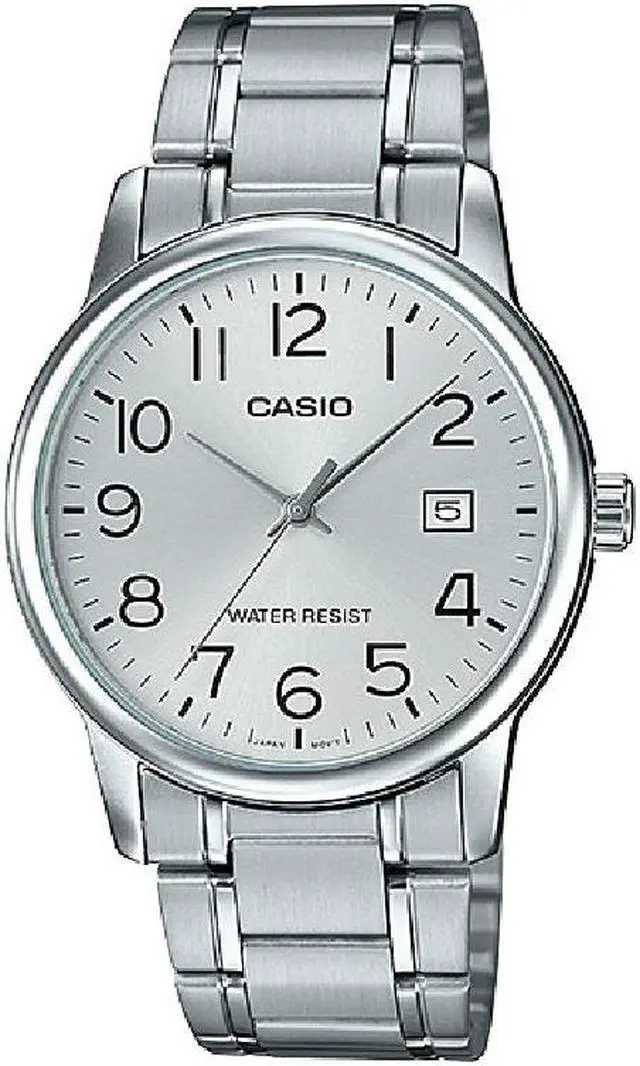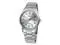 Round silver tone dial Silver tone hands and Arabic hour markers Date window at 3 o'clock Stainless steel case Scratch resistant mineral crystal Stainless steel bracelet with foldover clasp Quartz movement Water resistance up to 30 meters/99 feet Case diameter: 37 mm Case thickness: 10 mm Band width: 18 mm