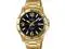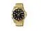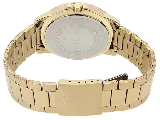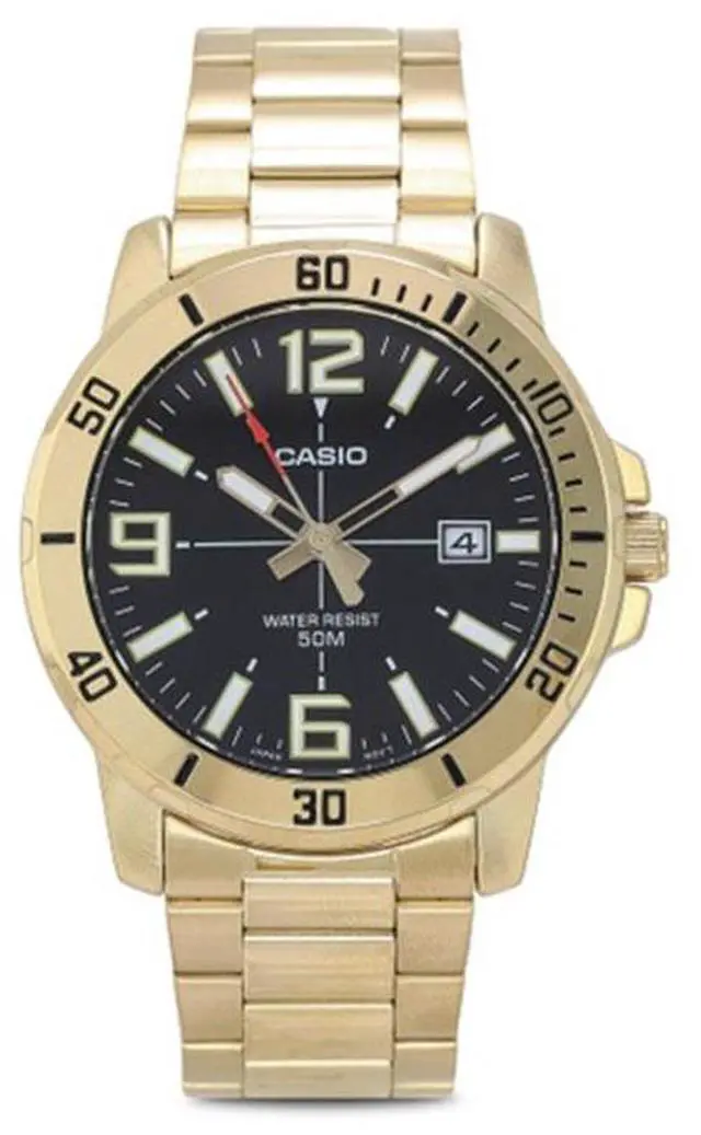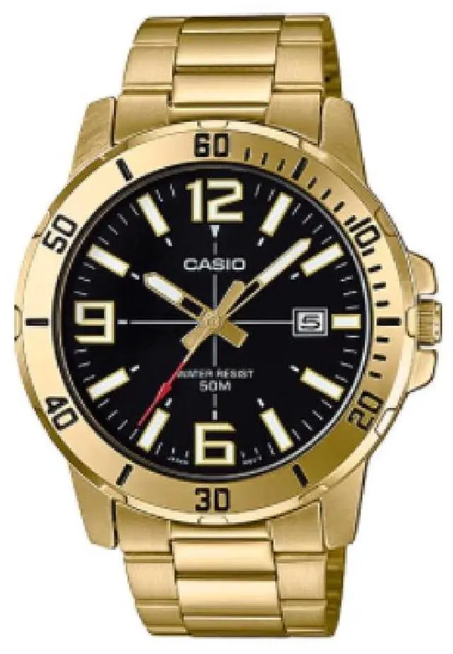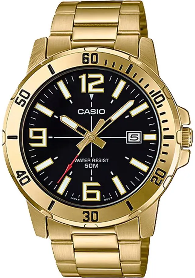 This Casio mens analog watch features a black dial paired with a gold tone stainless steel bracelet for a bold, standout look. Large hour markers and hands make the time easy to read at a glance. A date window adds everyday practicality without crowding the dial. The rotating bezel reinforces the sporty, structured design. Built for daily wear, this watch balances visual impact with functional simplicity.