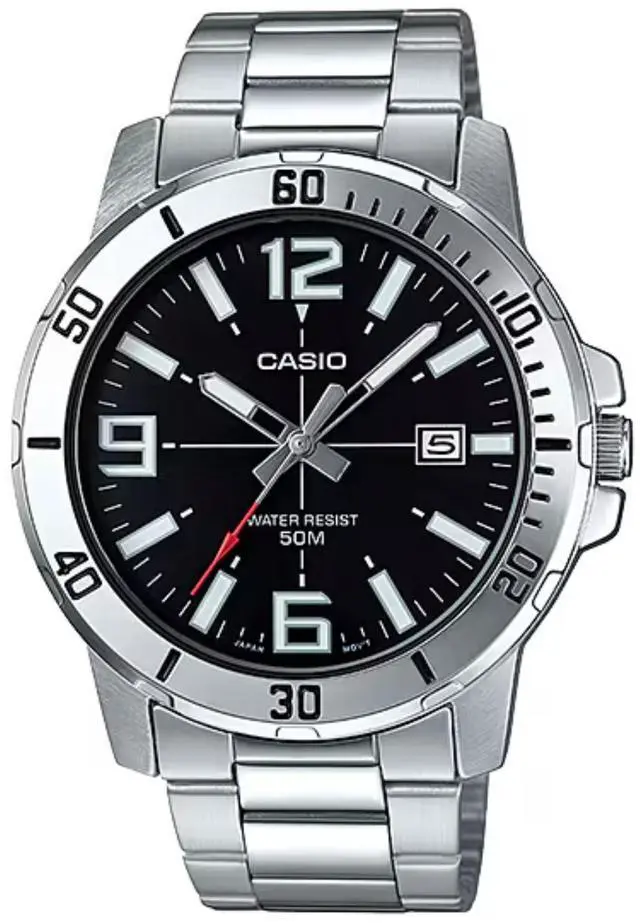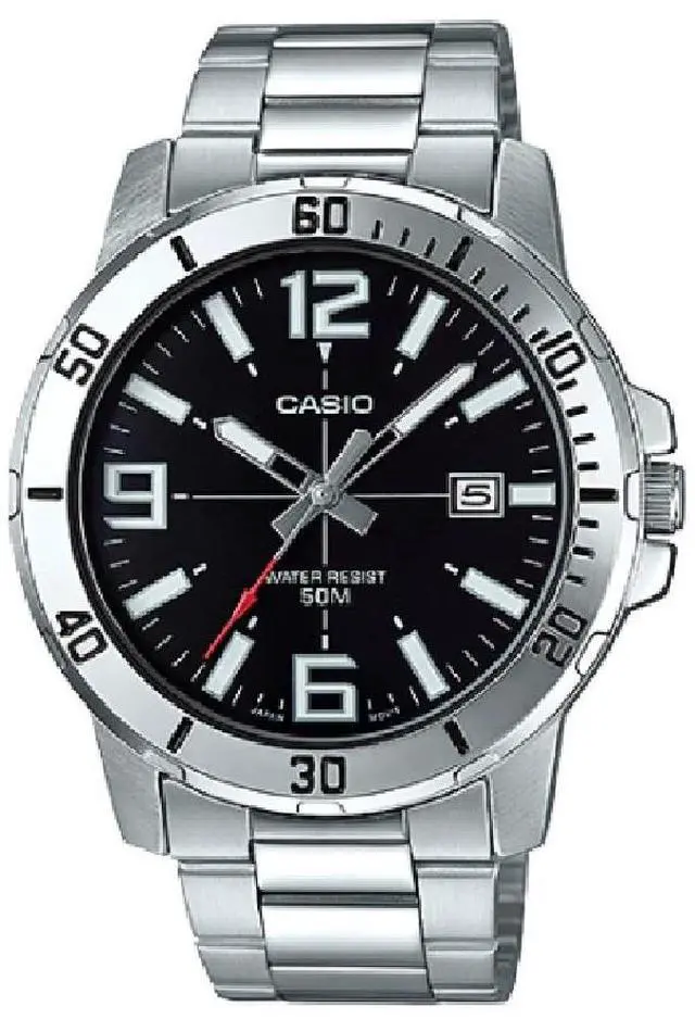 This mens analog Casio watch features a bold black dial with large luminous markers designed for excellent legibility. A stainless steel bracelet and sporty bezel give it a strong, modern presence on the wrist. The analog display keeps the design clean while adding a rugged, everyday character. Built with a solid round case, it offers a confident fit suited for daily wear. Water resistance adds extra practicality for active lifestyles.