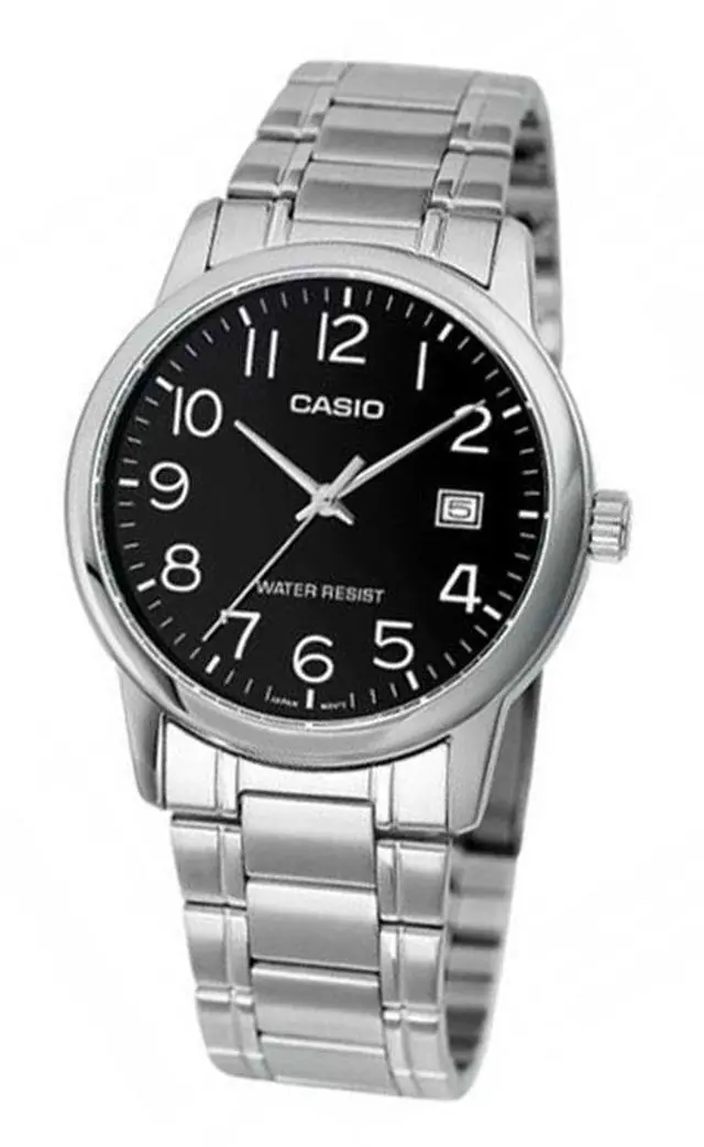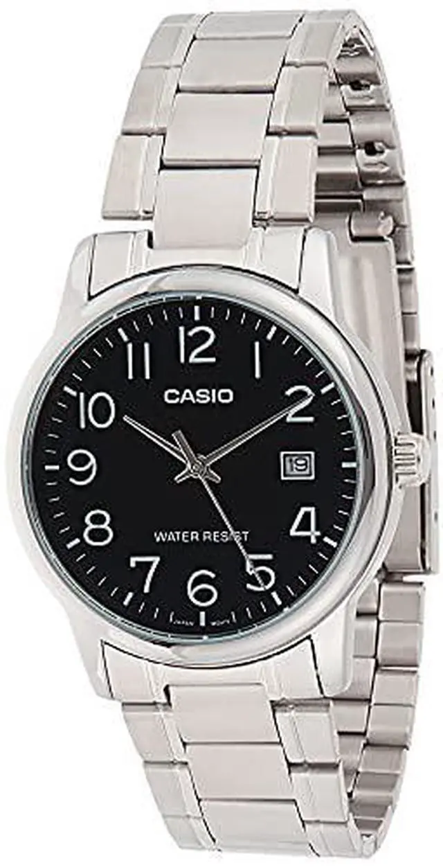The Casio MTP-V002D-1B delivers a sleek, timeless look ideal for any setting. Designed with a black dial featuring bold white Arabic numerals and a practical date display, this watch combines clarity with everyday sophistication. The stainless steel case and bracelet provide durability and comfort, while its water resistance makes it perfect for daily wear. A versatile piece that transitions effortlessly from business meetings to casual outings.