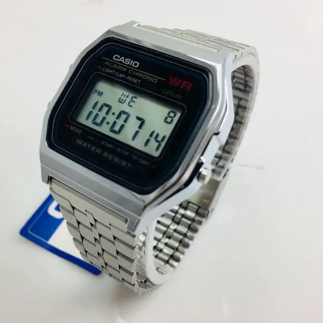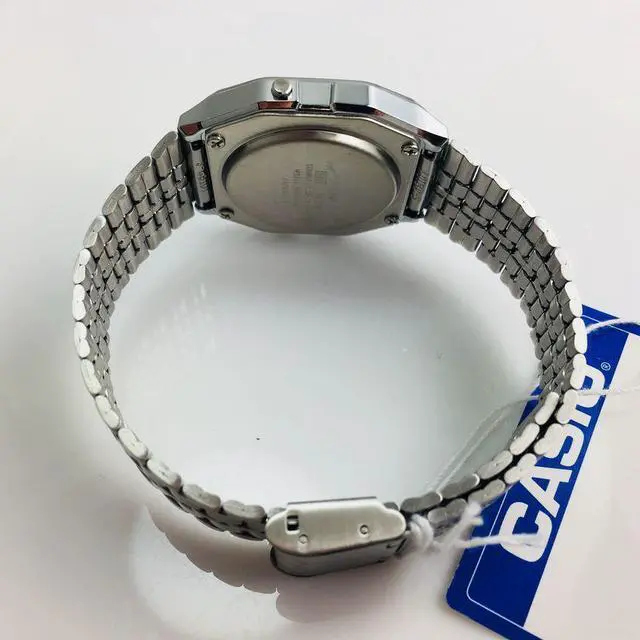 Men's Casio watch collection. Silver tone case. Stainless steel bracelet. Digital dial. Micro light. Alarm. Date and calendar.