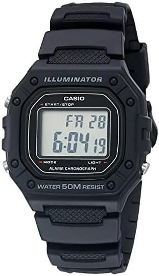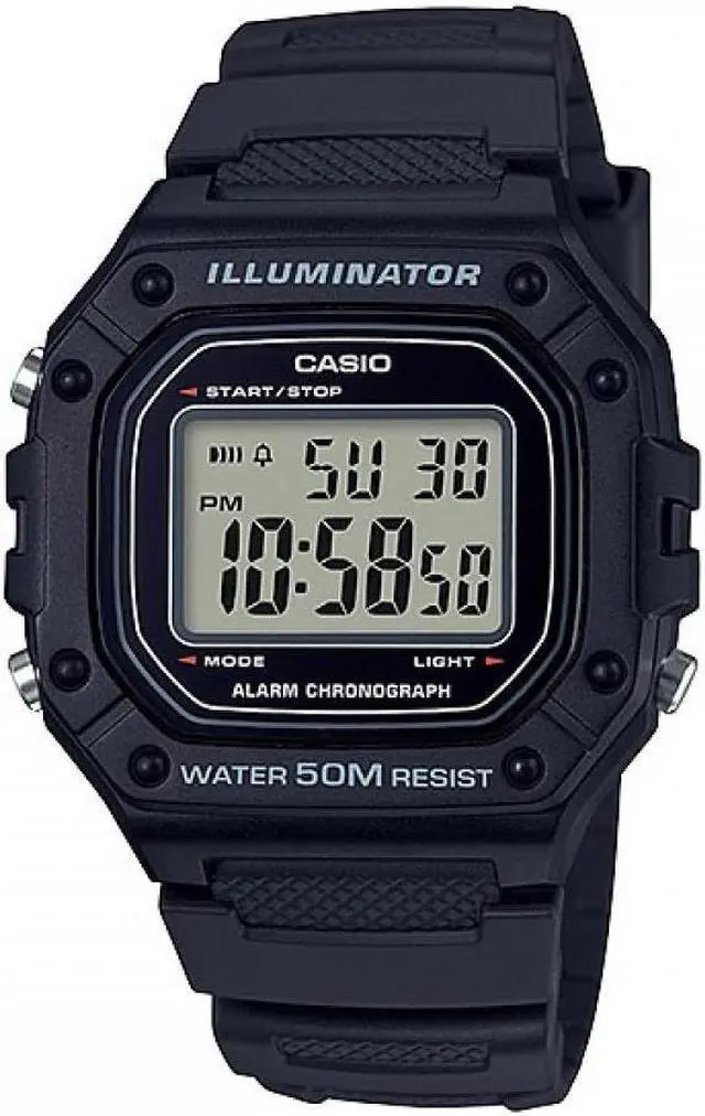The Casio W-218H-1AVCF is a digital watch that combines classic design with modern functionality. It features a square resin case measuring 44.4 mm in length, 43.2 mm in width, and 10.8 mm in thickness, ensuring a comfortable and lightweight fit at 37 grams. The watch boasts a clear digital display with large time digits, enhancing readability. An LED backlight ensures visibility in low-light conditions. With a 50-meter water resistance rating, the W-218H-1AVCF is suitable for daily use, including light water activities. Additional features include a 1/100-second stopwatch, daily alarm, and an auto-calendar set at 28 days for February.