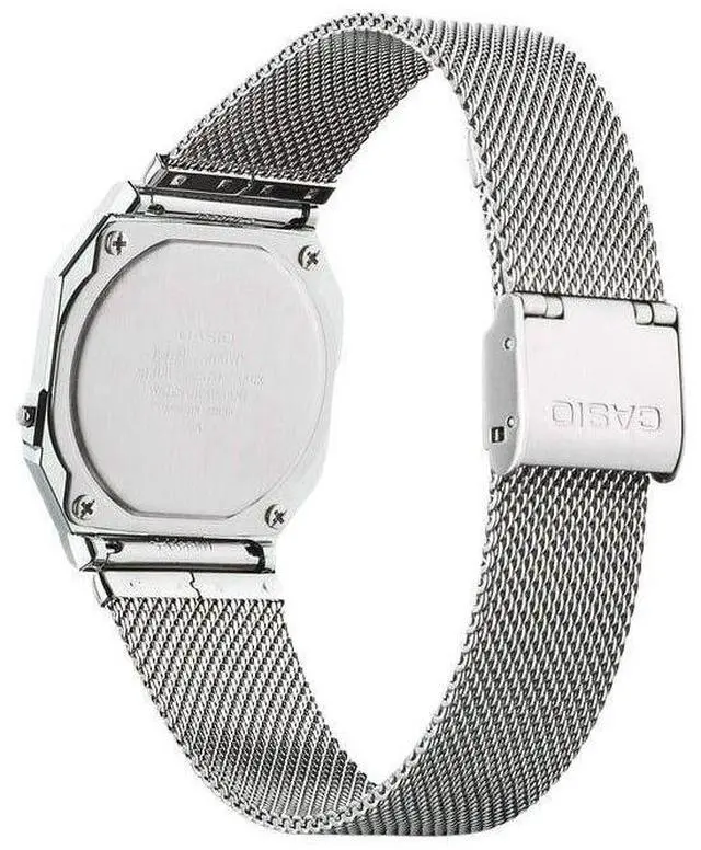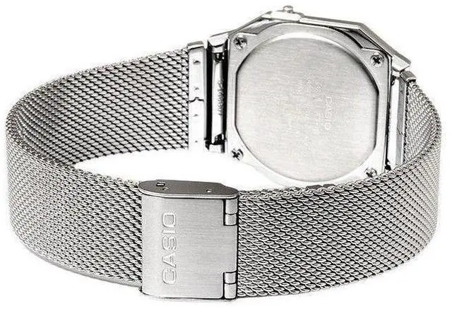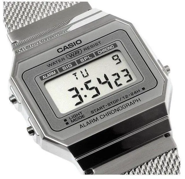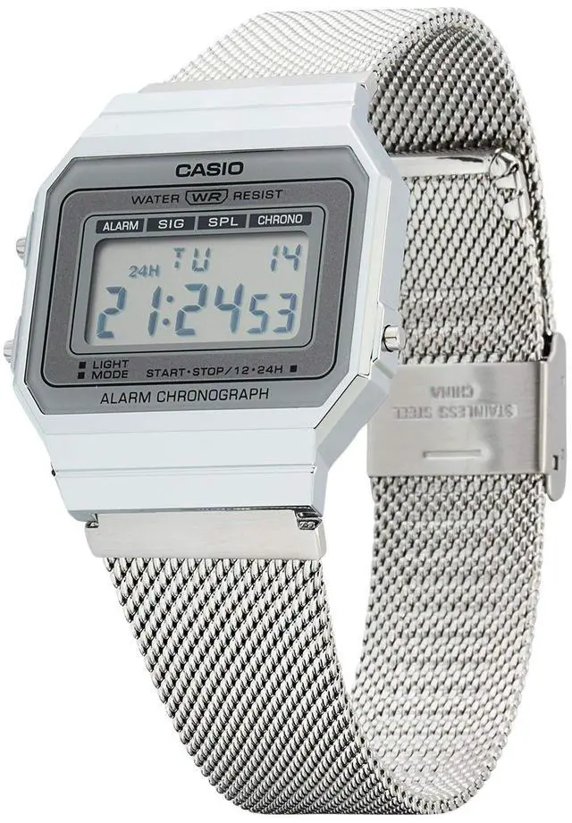 Casio Collection Watch A700WEM-7AEF, Unisex Silver Stopwatch. This Casio WatchA700WEM-7AEF has the Resin case, with Rectangular shape and silver color. Thebracelet is made of stainless steel mesh. silver, and the silver bezel. Thecrystal is Mineral, the Quartz movement, and the digital display. Among itsfunctions, the