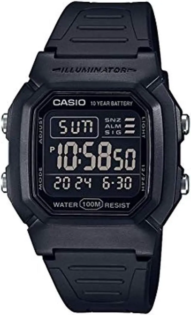The Casio W-800H-1BV is a classic digital watch known for its durability and practical features. Crafted with a black resin case and strap, it offers a lightweight and comfortable fit, ideal for daily wear. The watch boasts a 10-year battery life, minimizing maintenance concerns for the user. Its 100-meter water resistance makes it suitable for swimming and snorkeling, enhancing its versatility. Equipped with an LED backlight, the display remains readable in low-light conditions. Additional functionalities include dual time zones, a 1/100-second stopwatch, a multi-function alarm with a snooze feature, and a full auto-calendar pre-programmed until 2099.