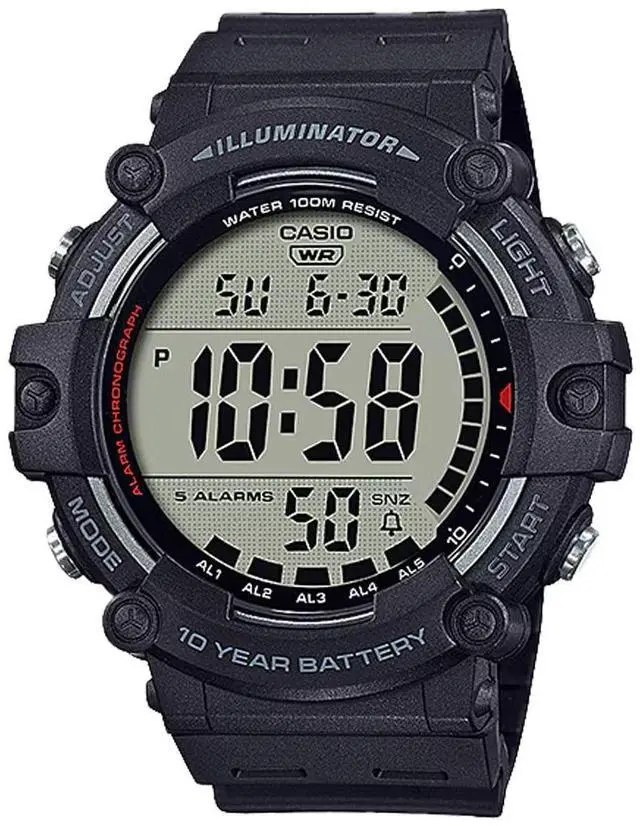 The Casio AE-1500WH-1AV is a robust digital sport watch designed for men, featuring a clear black dial housed in a durable resin case. Its large, easy-to-read display ensures quick time checks during any activity. The watch boasts a 10-year battery life, minimizing maintenance concerns. Equipped with a 1/100-second stopwatch, countdown timer, and dual time feature, it caters to various timekeeping needs. Five daily alarms help keep you on schedule, while the LED backlight ensures visibility in low-light conditions. With 100-meter water resistance, the AE-1500WH-1AV is suitable for swimming and snorkeling.