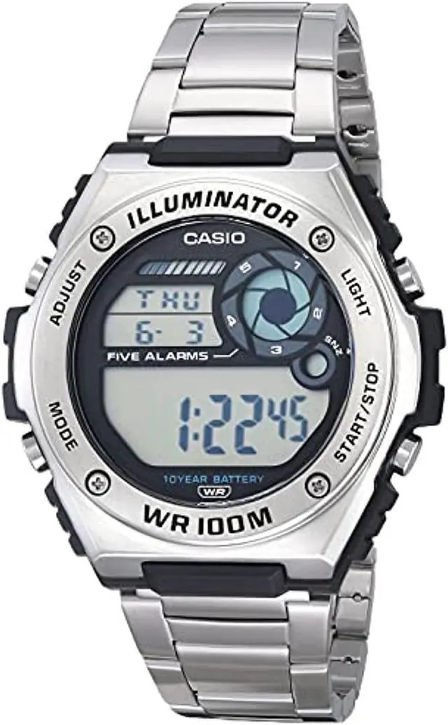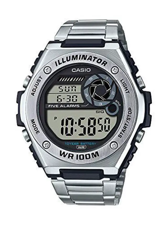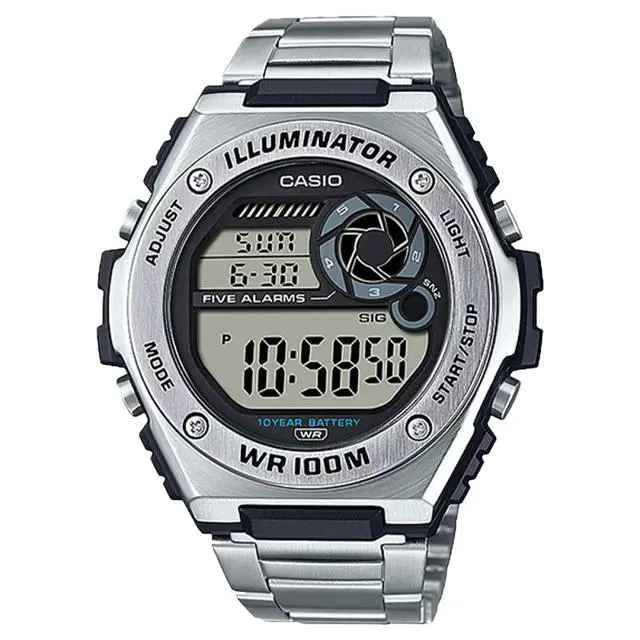LED light; world time function; stop function - 1/100 sec. - 24 hours. Timer - 1/1 sec.? 24 hours. Daily alarm, automatic calendar with date, month and weekday, 12/24 hour format, mineral glass, stainless steel housing, stainless steel strap, 10 years - 1 battery, water resistance rating (10 bar).