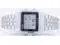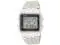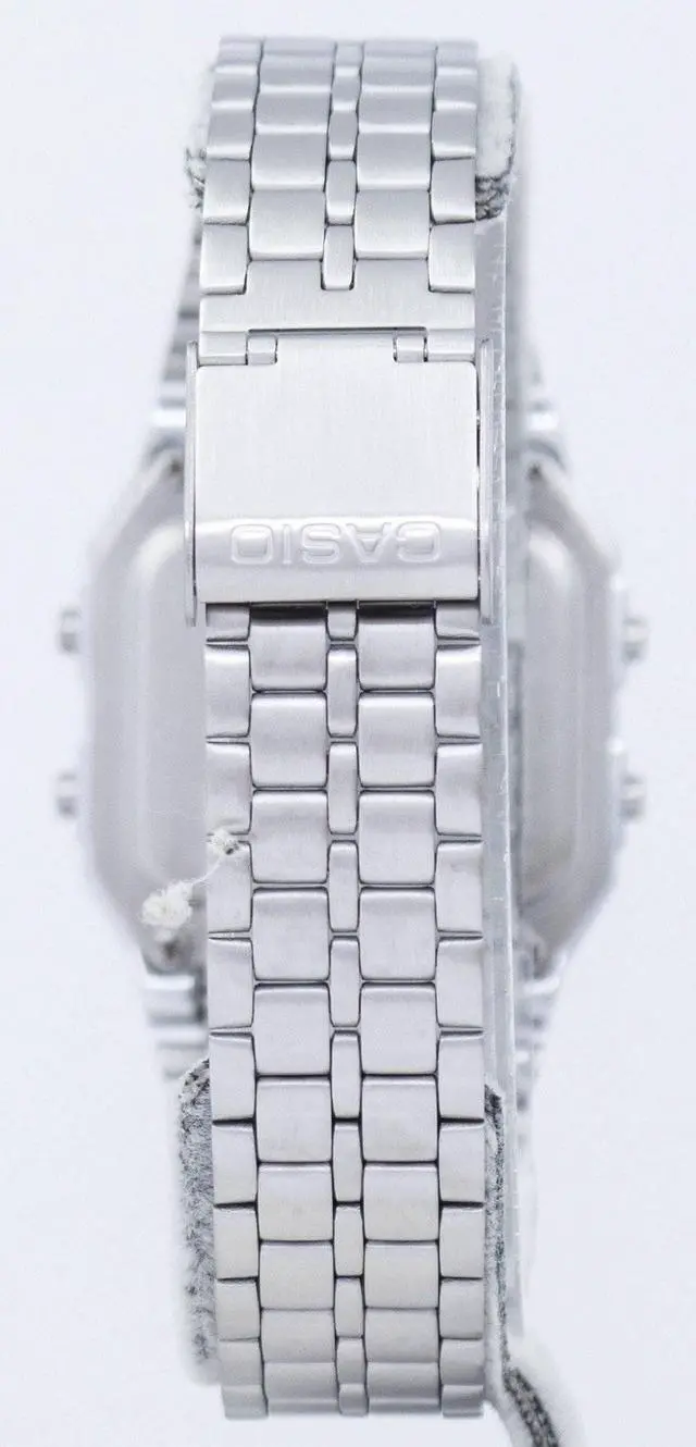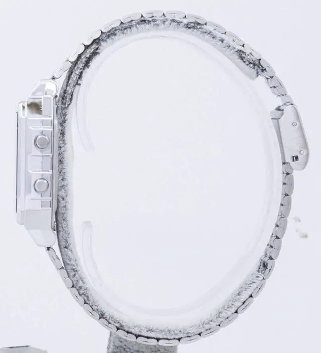 Mens vintage digital watch with a stainless steel case and band. Easy-to-read black digital display with world map accents. Water resistant to 50 meters. Features include a daily alarm 1/100 second stopwatch and countdown timer. Durable and reliable construction. The case size is 39.0 x 34.0 x 9.6 mm. The watch has a 12/24 hour format and can be set to display the time in either analog or digital format. The watch also has a date window and a day of the week indicator.