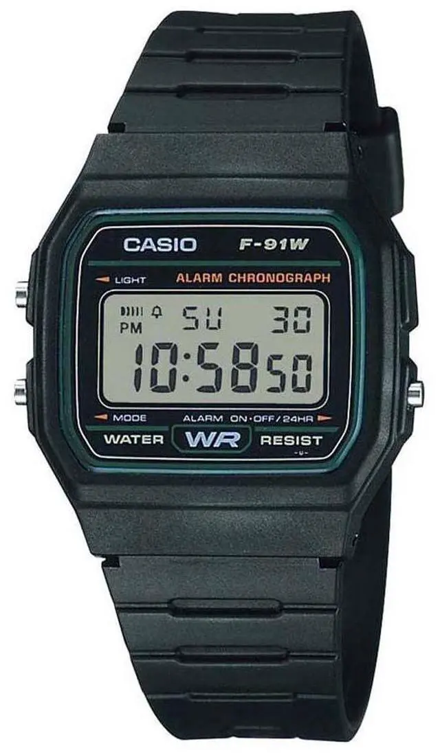 Micro-light. Case 38.2 x 35.2 x 8.5 mm. Case / bezel material: Resin. Resin Band. Water Resistant. Stopwatch. Daily alarm. Hourly time signal. Auto-calendar (set at 28 days for February). LED light.