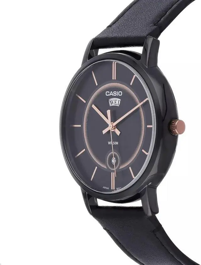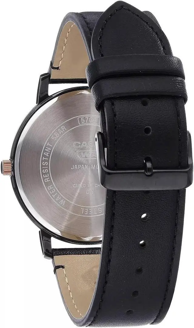 Casio Men's Stainless Steel Analog Leather Strap Watch, Black Dial