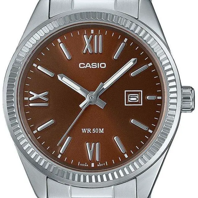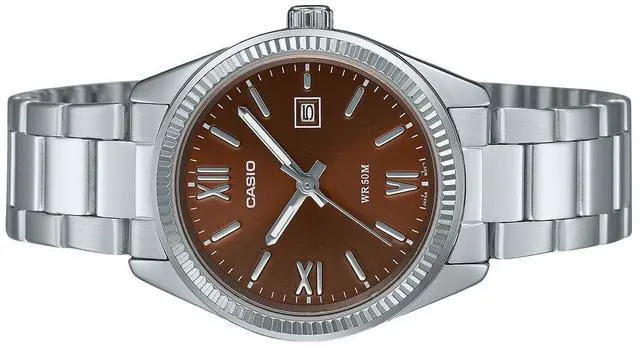 Experience timeless elegance with the Casio LTP-1302DD-5AV, featuring a rich brown dial that adds a warm, luxurious touch to your wrist. Crafted with a stainless-steel case and bracelet, this watch combines durability with classic style. Its precise quartz movement ensures reliable timekeeping, while 50-meter water resistance offers everyday practicality. Perfect for both formal and casual settings, this watch is a versatile addition to any collection