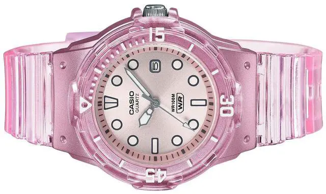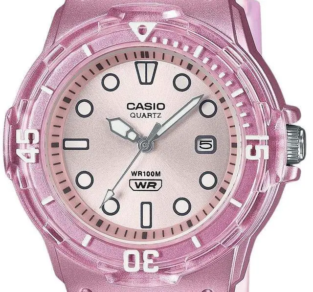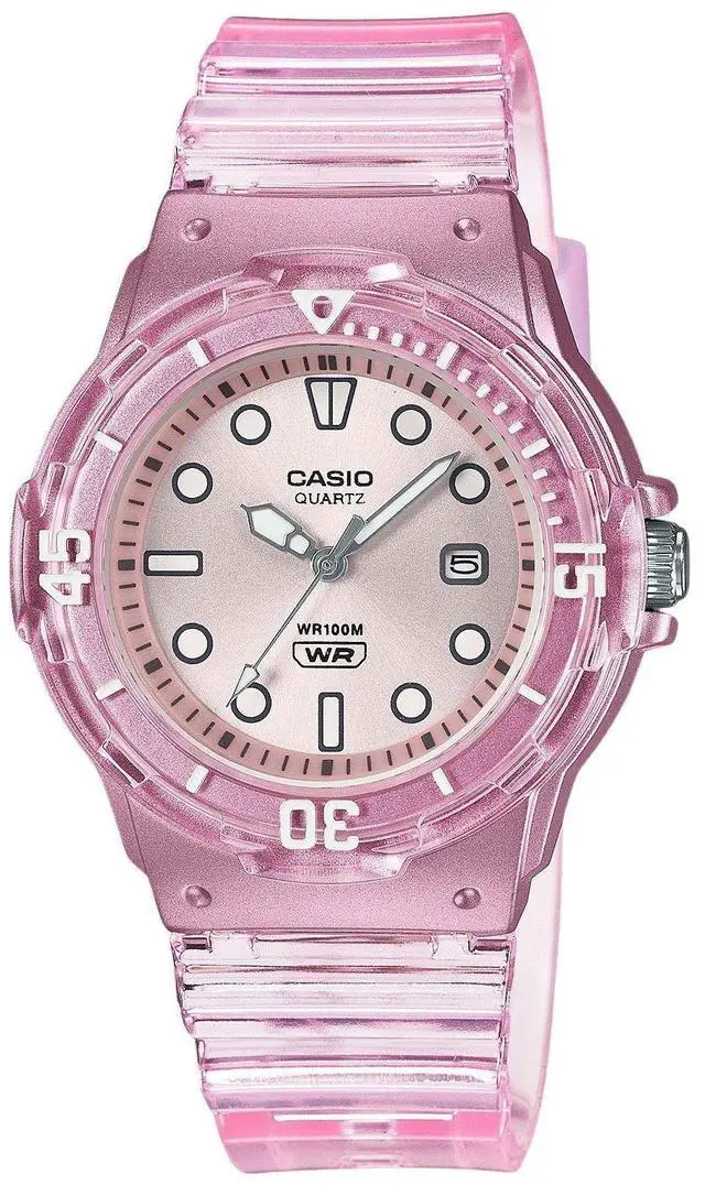 The Casio LRW-200HS-4EV stands out with its playful translucent pink resin strap, bringing a fresh pop of color to your wrist. Its sleek silver dial adds a touch of elegance, while the 100-meter water resistance ensures reliability in aquatic activities. Built for everyday wear, the lightweight design offers comfort without compromising on durability. The precise quartz movement ensures accurate timekeeping, making this watch a perfect combination of style and practicality for any occasion.