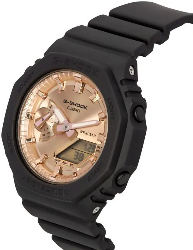 Shine bright with the Casio GMA-S2100MD-1A, featuring a mesmerizing rose gold dial that adds a touch of luxury to your wrist. This analog-digital G-Shock watch is designed for durability, with 200-meter water resistance and a sturdy resin strap for all-day comfort. The shock-resistant construction ensures it can withstand the toughest conditions, making it perfect for those who lead an active lifestyle. Combining elegance with resilience, the Casio GMA-S2100MD-1A is a versatile choice for any occasion.